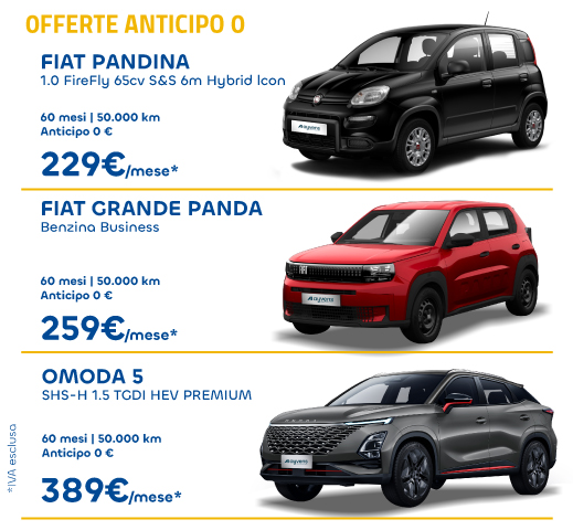 L’Offerta Anticipo Zero ti permette di guidare un’auto nuova con 16 servizi inclusi, tra cui manutenzione, assicurazione e assistenza H24, tutto in un unico canone. Hai la garanzia di costi certi e trasparenti, senza anticipo e senza maxi rata finale.