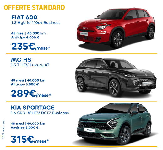 L’Offerta Standard ti permette di guidare un’auto nuova con 16 servizi inclusi, tra cui manutenzione, assicurazione e assistenza H24, tutto in un unico canone. Hai la garanzia di costi certi e trasparenti, senza maxi rata finale.